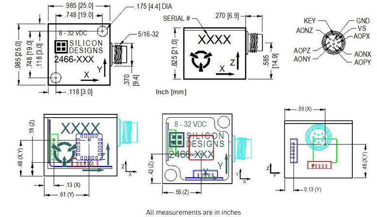 傳感器外殼表面清晰標注各軸向標識,定義正加速度方向為箭頭指示方位。模塊化封裝結構提供多樣化安裝方案,可通過配套螺釘、工業粘接劑或磁性基座實現快速固定。該系列產品憑借緊湊型結構與靈活部署特性,可適配復雜工業場景中的空間限制要求。