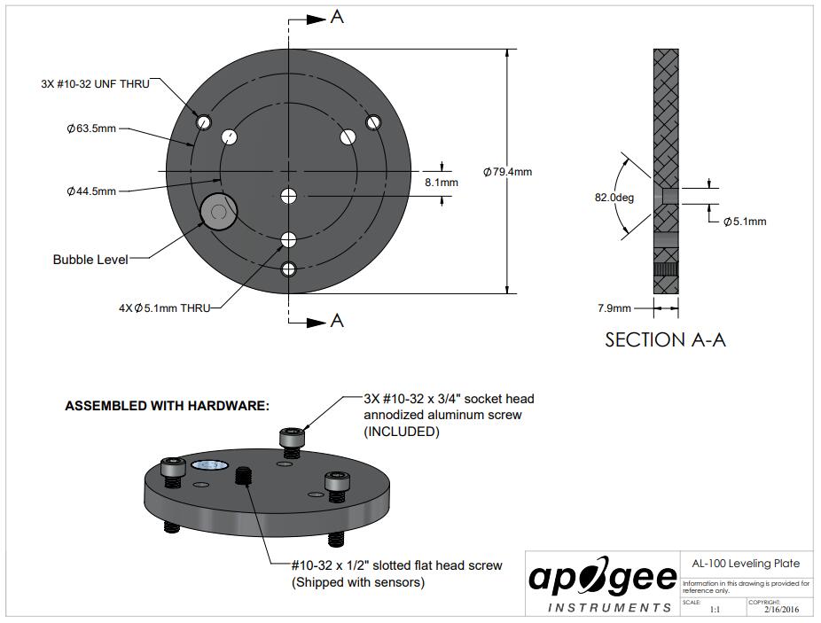 AL-100 水平板設計用于平面或安裝到表面,例如木材。水平板可以容納所有 Apogee 儀器的太陽輻射傳感器,例如總輻射表、量子傳感器等。正確的傳感器安裝要求傳感器在大多數應用中盡可能水平。調平板包含一個集成的氣泡水平儀,設計用于在 -29 到 55 ℃ 之間工作,使調平變得簡單而準確。