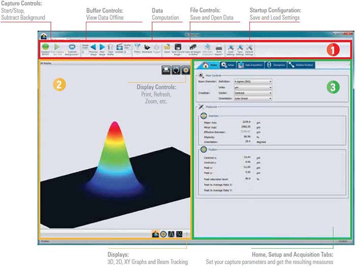 3 - 主頁和設置選項卡 —— 軟件右側包含主頁、設置和數據采集選項卡。主頁選項卡允許用戶選擇針對其測量的主要控制(光束直徑清晰度、瞄準器中心和定向),并在其下顯示測量結果。設置選項卡允許用戶設置測量參數(曝光時間、圖像定向和平均值、主動區(qū)等),數據采集選項卡允許用戶保存測量值或測量值及完整圖像,并輸入采集的采樣率和總持續(xù)時間。單擊計算面板中的顯示/隱藏選項按鈕,還可調出具有控制功能的更多選項卡。