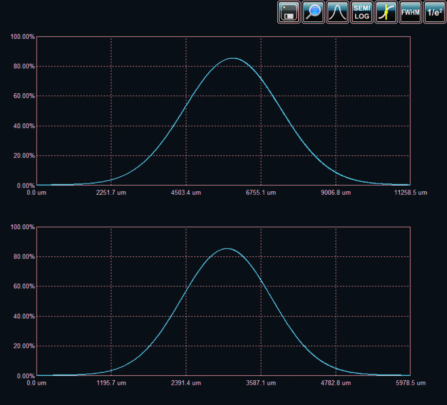 XY 顯示屏 —— XY 顯示屏繪制沿瞄準器的光束橫截面圖。其具有很多有用工具,包括縮放、光標、半峰全寬和 1/e2 級別條。另外還可以半對數格式顯示圖形,以增強光束低強度部分的細節(jié)。
