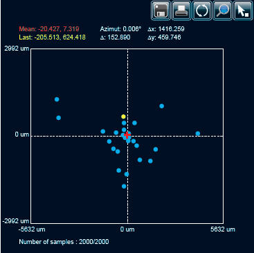 光束跟蹤顯示屏 —— 光束跟蹤顯示屏允許用戶對光束在傳感器上中心位置的變化進行可視化顯示。其可顯示最后計算位置和以前的位置,除非用戶重置視圖。另外還可顯示所有計算值的平均數位置,并提供有關 X 軸和 Y 軸位置穩(wěn)定性的信息。此工具非常適合于監(jiān)控光束隨時間變化的指向穩(wěn)定性。