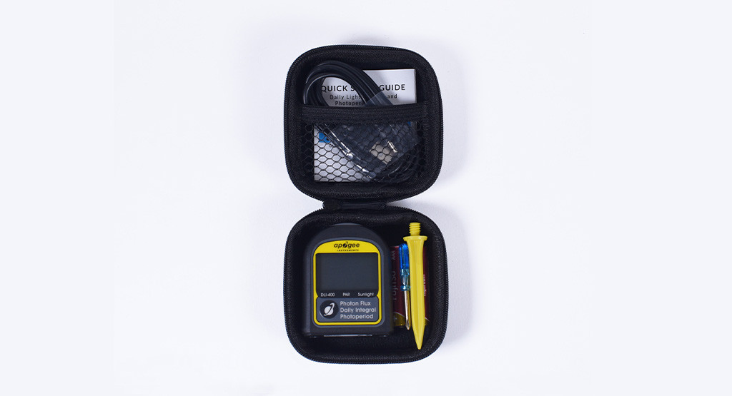 DLI-400 日光計是2022 年的新產品,用于抽查光合有效輻射(PAR;400–700 nm)水平并測量日光積分(DLI) 和光周期。DLI-400 是一種低成本選項,僅在陽光和某些寬帶光源下準確。PAR、DLI 和光周期影響植物的生長和發育,通常在溫室和生長室中測量它們以幫助進行光照管理和決策。DLI是指24小時內入射在一個平面上的PAR或擴展PAR(ePAR)的總量,單位為每天每平方米的摩爾數。光周期是 24 小時內 PAR 或 ePAR 入射的總時間,以小時 (h) 為單位表示。
