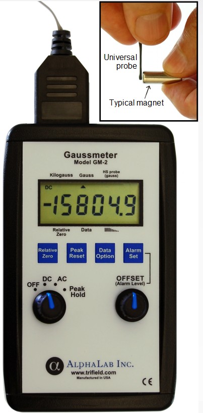 GM2 型設(shè)計(jì)用于測量強(qiáng)磁場和中等磁場,例如來自磁鐵和螺線管的磁場. 它使用起來快速直觀,具有極高的動態(tài)范圍,測量范圍為 0.0 至 19,999.9 高斯,步長為 0.1 高斯。大于 20000 高斯時,范圍會自動更改,讀數(shù)為 20.000 至 29.999 千高斯(20000 至 29999 高斯),步長為 1 高斯。因此,可以測量小至 0.1 高斯的變化,例如,在 14,000 高斯場(典型的永磁體強(qiáng)場)中。通過可選的高穩(wěn)定性探頭,它具有 0.01 高斯分辨率。(高穩(wěn)定性探頭范圍為 +/- 799.99 高斯)。GM2 還可以測量高達(dá) 10,000 高斯的交流場。快速峰值保持功能(2 毫秒窗口)捕獲并顯示任何瞬變,無論是正的還是負(fù)的。此外,可以根據(jù)需要選擇兩種快速(2 毫秒)報警功能中的任何一種。
