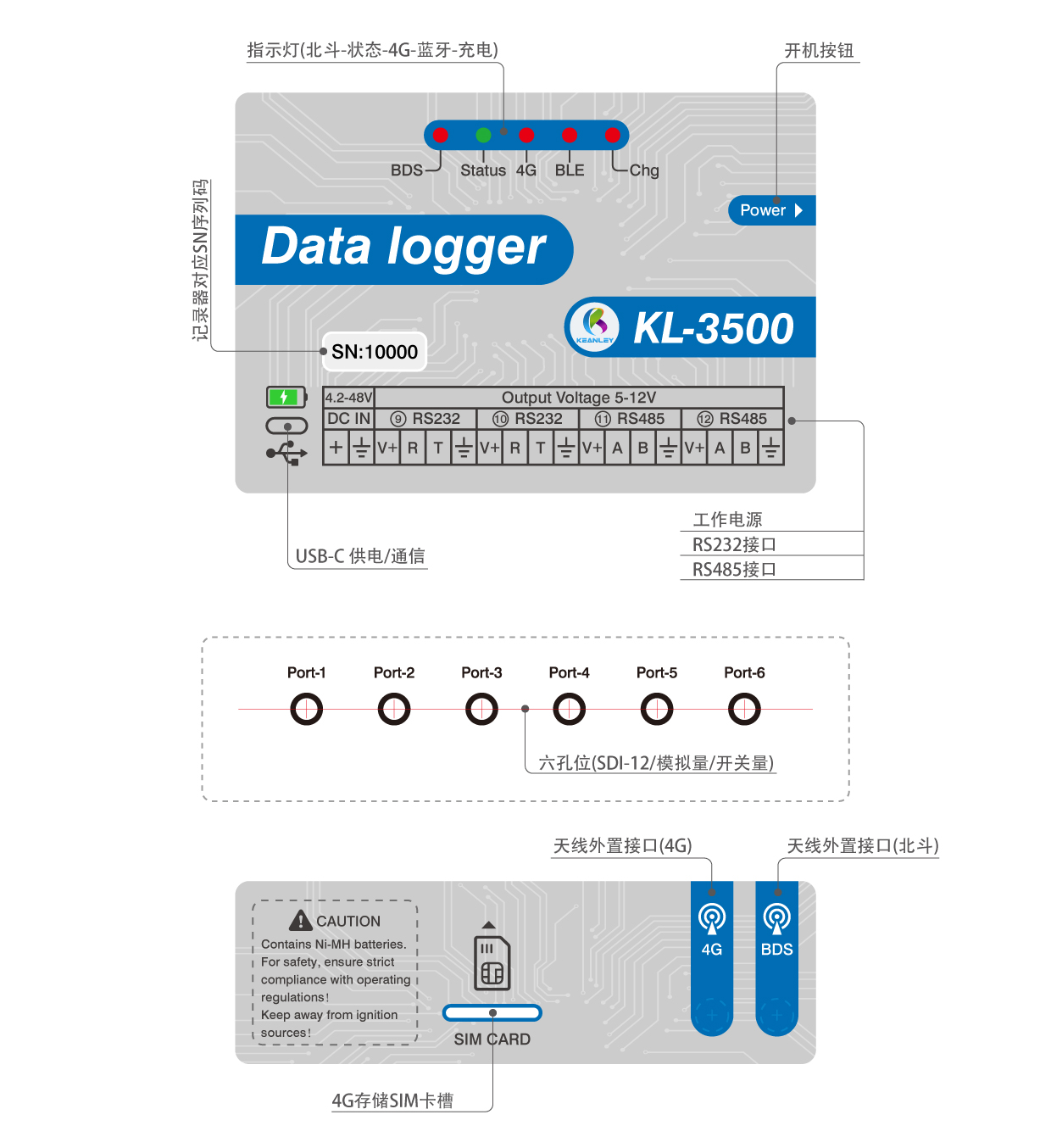 KL-3500專門用于SDI協議和DDI模式,RS485和RS232以及模擬量和脈沖量的傳感器。數據記錄儀有12個插接口(6個傳感器接口,2個帶供電的485,2個帶供電的232,1個大氣壓溫度接口,一個北斗數據口)具體參考軟件界面里的接口說明,一個2P的3.81端子供電口,1個TYPE-C接口(可供電和通信)1個電源按鈕,5個狀態指示燈(LED1為北斗狀態指示燈,LED3為運行狀態指示燈,LED2為4G狀態指示燈,LED4為藍牙狀態指示燈,LED5為充電狀態指示燈),2個天線接口(4G通信天線,北斗天線),上部是電池倉可使用6節鎳氫電池或堿性電池。