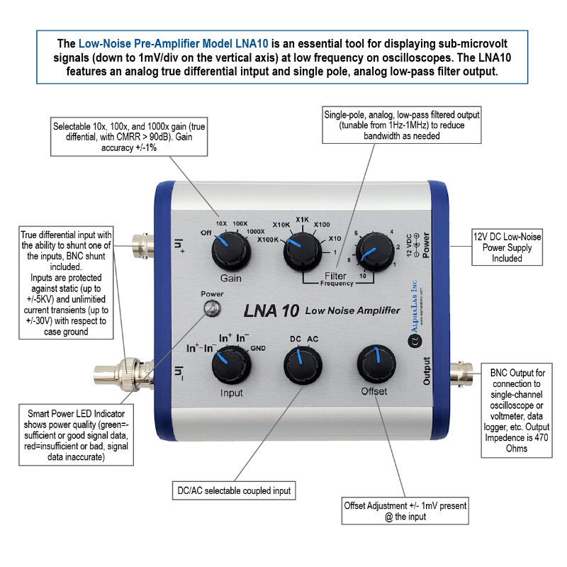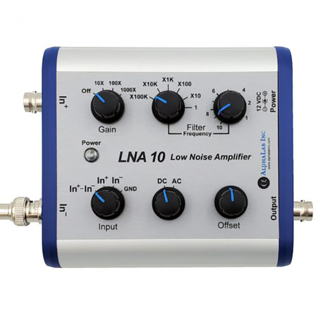 使用此前置放大器,可以在示波器上顯示亞微伏信號,而這些信號在垂直軸上通常只能下降到 1mV/div。前置放大器包括一個模擬真差分輸入和一個模擬低通濾波器(可調諧 1Hz-1MHz)。f >100Hz 的輸入參考 RMS 噪聲頻譜為 4 nV/√Hz 或更低,因此,例如,即使增益為 1000 x,從 100 Hz 到 1000 Hz 的總噪聲在 1mV 上也小于 1 div 峰峰值/div 垂直范圍設置(假設為低阻抗輸入)。大多數示波器設計用于顯示高頻(快速)事件,這些事件本質上可能具有毫伏或更高的噪聲。然而,低頻信號的固有噪聲要小得多,因此低噪聲前置放大器和帶寬限制濾波器對于低頻小信號至關重要。* 大多數放大器在 ~1000 Hz 以上的所有頻率下都具有白噪聲頻譜(平坦的頻譜曲線)。此白噪聲頻譜通常指定為每√Hz 一定數量的 nV。然而,與典型的無源電阻器不同,固態放大器的等效輸入噪聲頻譜(以 nV/√Hz 為單位)在低頻時變得更高。對于 f ≤ 10Hz ,nV/√Hz 的數量通常與 ~1/f 成正比。下表顯示了 LNA 10 在不同頻率范圍內的實際噪聲。在所有頻率下,LNA 10 的噪聲都比典型的固態放大器低得多。