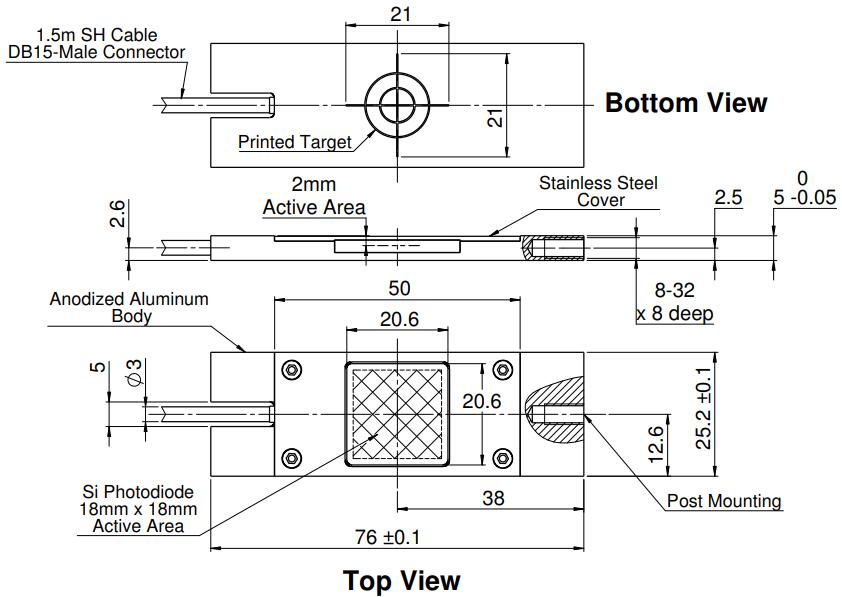 薄型功率傳感器的占地面積為 76.0 mm x 25.2 mm,與標準顯微鏡載玻片相匹配。傳感區域密封且可清潔,使其能夠輕松測量使用水/油/甘油等浸沒介質以及空氣中的高數值孔徑物鏡的輸出。