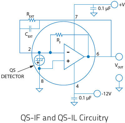 我們的 QS-VL 和 QS-IL 混合型探測器設計以較低的頻率在很大程度上提高電壓輸出,因此,探測器內包含電阻值在 100 GΩ 至 300 GΩ 范圍內的負載和反饋電阻。同時,此類探測器使用 8 引腳 TO 封裝,允許安裝“外部電阻器”以降低輸出并增加帶寬。左邊所示電路圖為 QS5-IL 探測器(帶 MT 涂層)的典型試驗接線圖。另一方面,我們的 QS-IF 系列設計用于高帶寬應用,因而內含一個較小的 100 MΩ 反饋電阻。