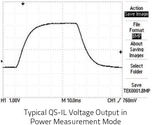如果您使用我們的 QS-IL 混合型探測器測量您的 CW 或高重復頻率源(準 CW)的功率(以瓦特為單位),那么需要使用一個光斬波器。左圖所示為 QS5-IL 與我們的 QS-I-TEST 評估測試盒配合使用時的典型電壓輸出。請注意,電壓輸出大致呈“方波”形,其上升和下降次數由電路的 RC 時間常數決定。光功率與峰值電壓和基準電壓之差成正比。在該模式下操作時,我們會對這些設備進行校準。