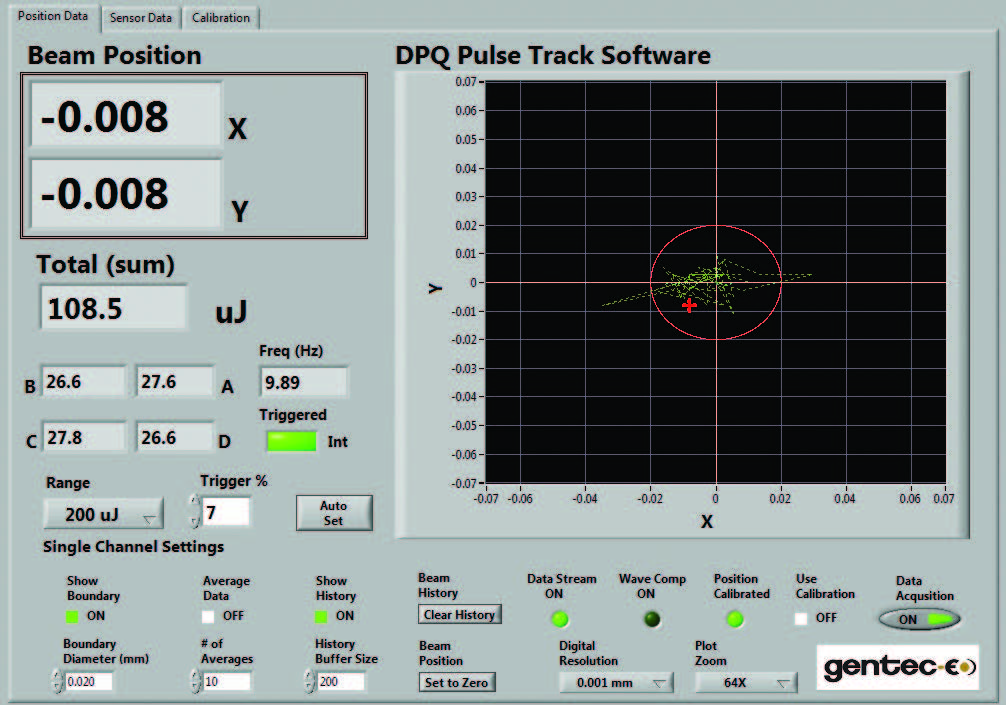 QUAD-4Track 包含功能強(qiáng)大的單機(jī)軟件 LabView,用于控制儀表、處理數(shù)據(jù)并顯示 X 軸和 Y 軸位置。該軟件還可顯示脈沖源的能量或功率以及重復(fù)率。本界面中的大型圖表顯示線束的矩心位置并實(shí)時(shí)追蹤其移動(dòng)。該關(guān)鍵包含許多實(shí)用功能,例如:設(shè)置邊界、放大(2 倍至 128 倍)、設(shè)置分辨率、數(shù)據(jù)記錄等,不一而足。綠線代表追蹤歷史。