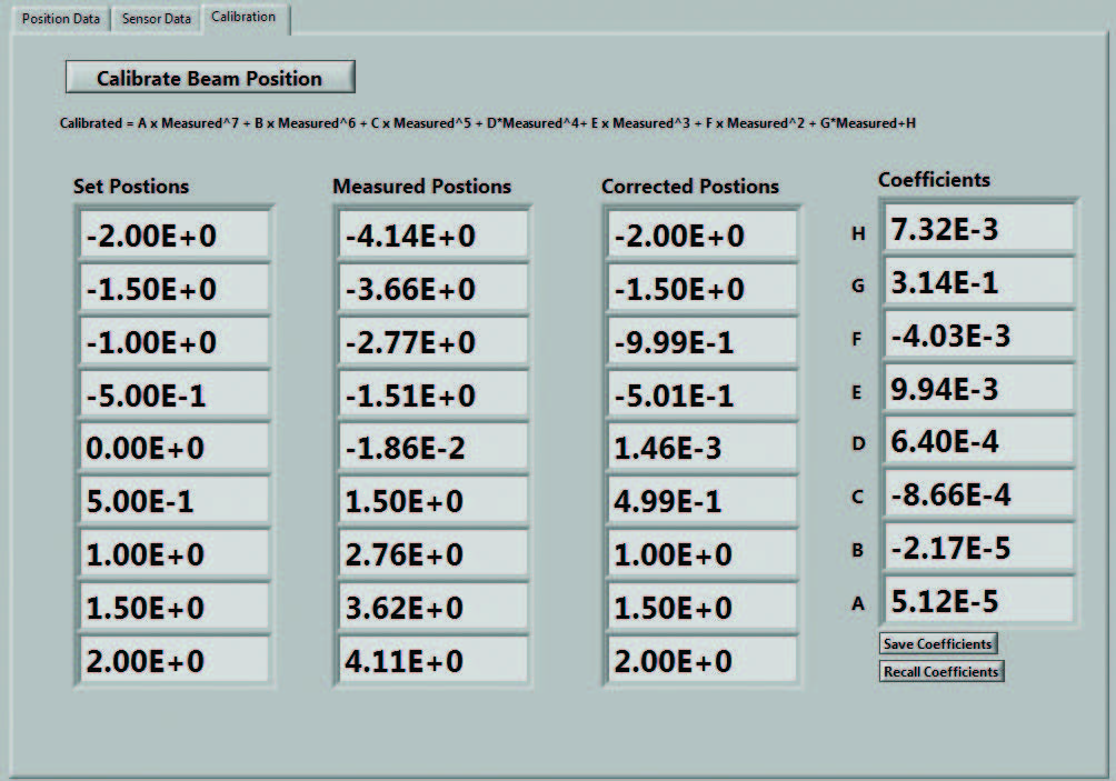 這需要使用微米級(jí)線性階段(只有 1 根軸)。如左側(cè)的校準(zhǔn)界面所示,該程序包括儀表調(diào)零,移動(dòng) QUAD 探測器至九個(gè)分立位置(+2000 mm 至 -2000 mm)并采集 QUAD 讀數(shù)。然后,該程序會(huì)確定校正系數(shù)(最后一欄)并將其運(yùn)用到原始數(shù)據(jù)以到達(dá)“校正位置”。現(xiàn)在,QUAD 探測器已校準(zhǔn)完畢!
