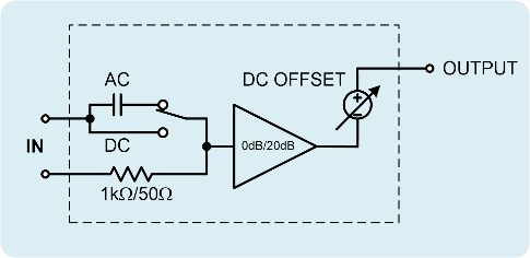 圖1顯示了TS250波形放大器的功能等效圖。它由交流耦合或直流耦合輸入、可選輸入阻抗(高阻抗或 50Ω)、可選增益級(jí)(0dB 或 20dB)、高電流放大器和直流輸出偏移組成。可調(diào)節(jié)的直流偏置設(shè)置輸出直流電壓。此直流偏移功能非常適合 LDO 或放大器 PSRR 測(cè)量,因?yàn)樗鼈冃枰绷麟妷骸?
