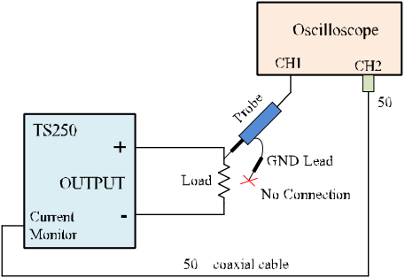 TS250 波形放大器包括一個(gè)電流監(jiān)視器輸出,可連接到示波器以監(jiān)視波形電流。當(dāng)端接到 50Ω 時(shí),電流監(jiān)視器增益范圍為每安培 100mV。例如,2A 輸出電流將在電流監(jiān)視器輸出上產(chǎn)生 200mV 輸出電壓。如果示波器設(shè)置為高阻抗(1MΩ),則輸出電壓將為200mV/A。特別是對(duì)于高頻或方波,建議使用 50Ω 端接。如果示波器沒(méi)有內(nèi)置 50Ω 端接器,您可以購(gòu)買TS220 外部 50歐姆端接器來(lái)自我們。使用圖 2 將電流監(jiān)視器連接到示波器。如果如圖 2 所示同時(shí)監(jiān)控電流和電壓,建議不要連接電壓探頭接地線。