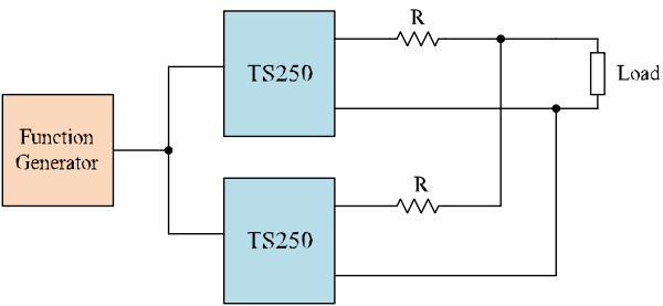 圖 3. 并聯(lián)兩個(gè) TS250 波形放大器使輸出電流加倍