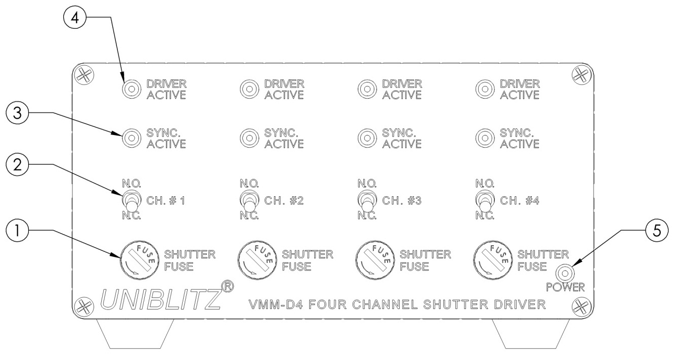 | 常開(kāi)/常閉開(kāi)關(guān) (2) | 此開(kāi)關(guān)的位置在 VMM-D3 接收到觸發(fā)信號(hào)之前確定快門狀態(tài) - 每個(gè)通道一個(gè) |