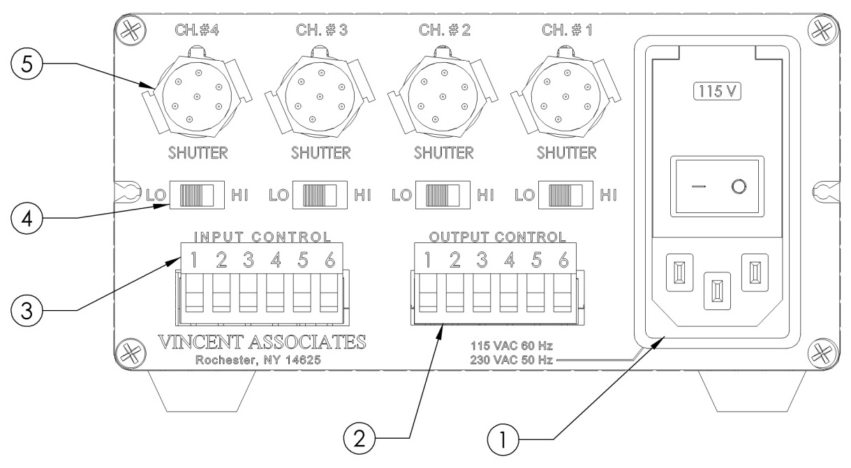 | 輸入控制 (3) | 為每個(gè)通道提供高電平有效控制。輸入 TTL 高 – 快門打開(kāi),輸入 TTL 低 – 快門關(guān)閉。端子 #5 – 有效高,輸入 TTL 高 – 所有快門打開(kāi),輸入 TTL 低 – 所有快門關(guān)閉。請(qǐng)參閱 VMM-D3/D4 用戶手冊(cè)第 15-19 頁(yè)中的端子排布局。 |