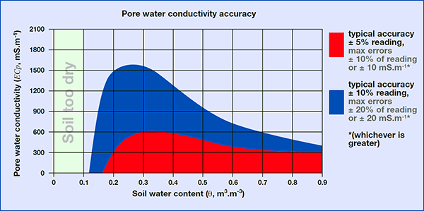 WET 傳感器能夠計算孔隙水電導(dǎo)率 (ECp),這是植物根部可用水的 EC。ECp 計算源自介電特性之間的近似關(guān)系。這特別適用于 WET 傳感器讀數(shù),這些讀數(shù)是在土壤/基質(zhì)的相同定義區(qū)域內(nèi)以相同頻率獲取的。該近似值在大多數(shù)土壤中有效,在礦棉和其他人造基質(zhì)介質(zhì)中尤其準(zhǔn)確。