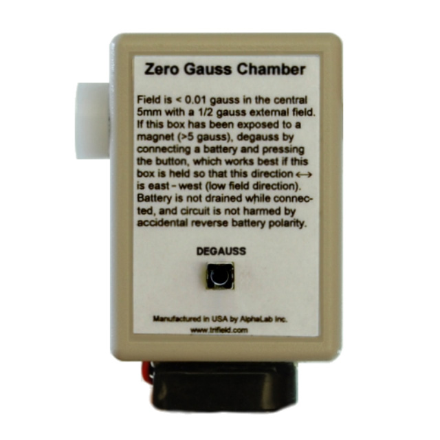 用外部消磁器消磁零高斯腔是困難的,即使消磁器是可用的。通常,外部消磁器的強度不足以消除內部屏蔽層的磁性,使用消磁器(相當大)也不方便。當使用 ZGC 時,只需按一下消磁按鈕,內部場就會在室中心5mm 寬 x9.4 mm 直徑區域內小于0.01高斯(在所有三個軸上)。連接電池時,除按消磁按鈕外,不消耗任何電源。即使這樣,一個典型的9伏電池(包括)可以超過1000萬消磁周期的電力。消磁后,無論腔室的方向如何(在地磁場內) ,磁場都小于0.01高斯。如果在消磁過程中,腔室的長軸(下圖中的左右方向)特別指向東西方向,那么內部磁場將小于0.002高斯,盡管大多數高斯計并不需要這樣的精度。