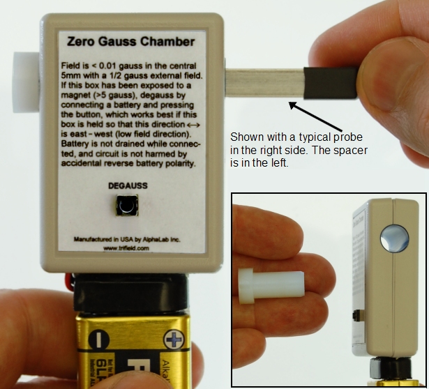 白色塑料部分(間隔器)可以在任何時候拆卸,但如果你想將高斯計探頭置于腔室的中心,就應該使用它。當放置在任何一端時,這個白色墊片將允許探針的一端插入到距離腔室中心1.6毫米處。因此,AlphaLab模型VGM, GM-2, GM-3, 1-ST和1-HS的實際傳感器將在腔室中正確地居中。零高斯區域直徑9.4毫米(0.370“),并占據中心5毫米(0.197“)在腔內。(腔室的長軸尺寸為36毫米,或1.42英寸)。在中心5毫米處,無論腔室朝向如何,按下黑色消磁按鈕后,磁場均< 0.01高斯。在消磁時,只要腔室不從其方向旋轉超過30度,它將保持< 0.01高斯。(請注意,如果室外的磁場小于0.6高斯,這是地球磁場的特征,則此規范有效。)插入如下所示的高斯計探頭并調零高斯計。