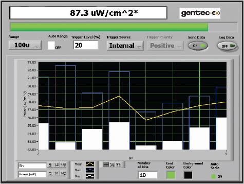 對于從 fJ 到 μJ 量程以及從紫外線到近紅外線的測量,我們建議使用 PE3B-Si 探測器。它使用低端能量探測器技術。另外 M-LINK 還使用了脈沖平均和降噪技術,為您提供各種優勢。在右側示例中,我們在“平均值”模式下工作并捕獲了一個數據集。條形分別代表小(白色)和大(藍色)能量值。帶狀圖根據平均能量值繪制而成。您需要選擇此處給出的“BINS”數。“統計數據”屏幕中提供了“脈沖平均”功能。