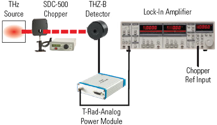 如果您需要測量信號可能淹沒在寬帶噪聲中的較低功率級別(即小于 5 μW),我們推薦使用此模擬設(shè)置選項(xiàng)。由 T-RAD-ANALOG 供電的模擬 THZ-B-DA 探測器電壓輸出連接至鎖定放大器輸入,SDC-500 斬波器的同步輸出則連接至參考輸入。鎖定放大器將鎖定斬波頻率,可通過撥入較長積分時間測量均方根很低的電壓。該電壓除以電壓響應(yīng)度 (V/W) 即等于輻射源的功率。