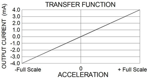 The Model 2227 generates an output current, the value of which varies with acceleration as shown in the adjacent figure.