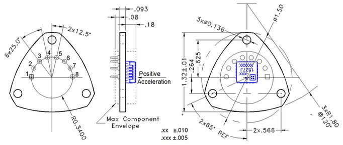 The model 2227 input axis is perpendicular to the PCB. The seismic center is located at the center of the PCB inside the LCC accelerometer, approximately 0.110 inches (2.75 mm) above the top of the PCB, the reference surface for the 2227.