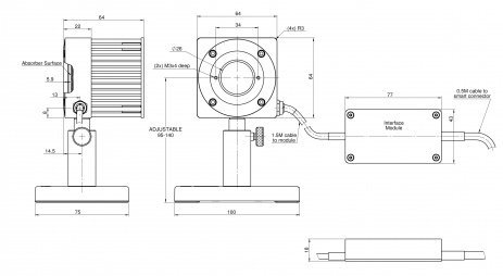 The BeamTrack series 50(150)A-BB-26-QUAD laser measurement sensor measures laser beam position as well as power and energy. It has a 26mm aperture and can measure position to 0.1mm accuracy. It measures power from 40mW to 50W continuously and to 150W intermittently.It can measure energy from 20mJ to 100J.The sensor comes with a 1.5m cable that connects it to the electronic box, and another 0.5m cable that connects the box to a Meter or PC interface.