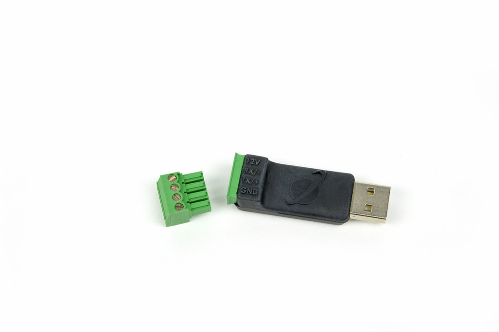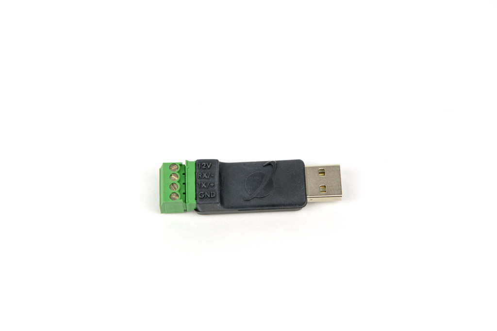 One side of the AC-422 features a USB connection for plugging into a computer. The other side of the AC-422 has +12 V out, GND, and Modbus data channels for connection to any standard Modbus sensor (for proper operation, please connect the ground wire first).