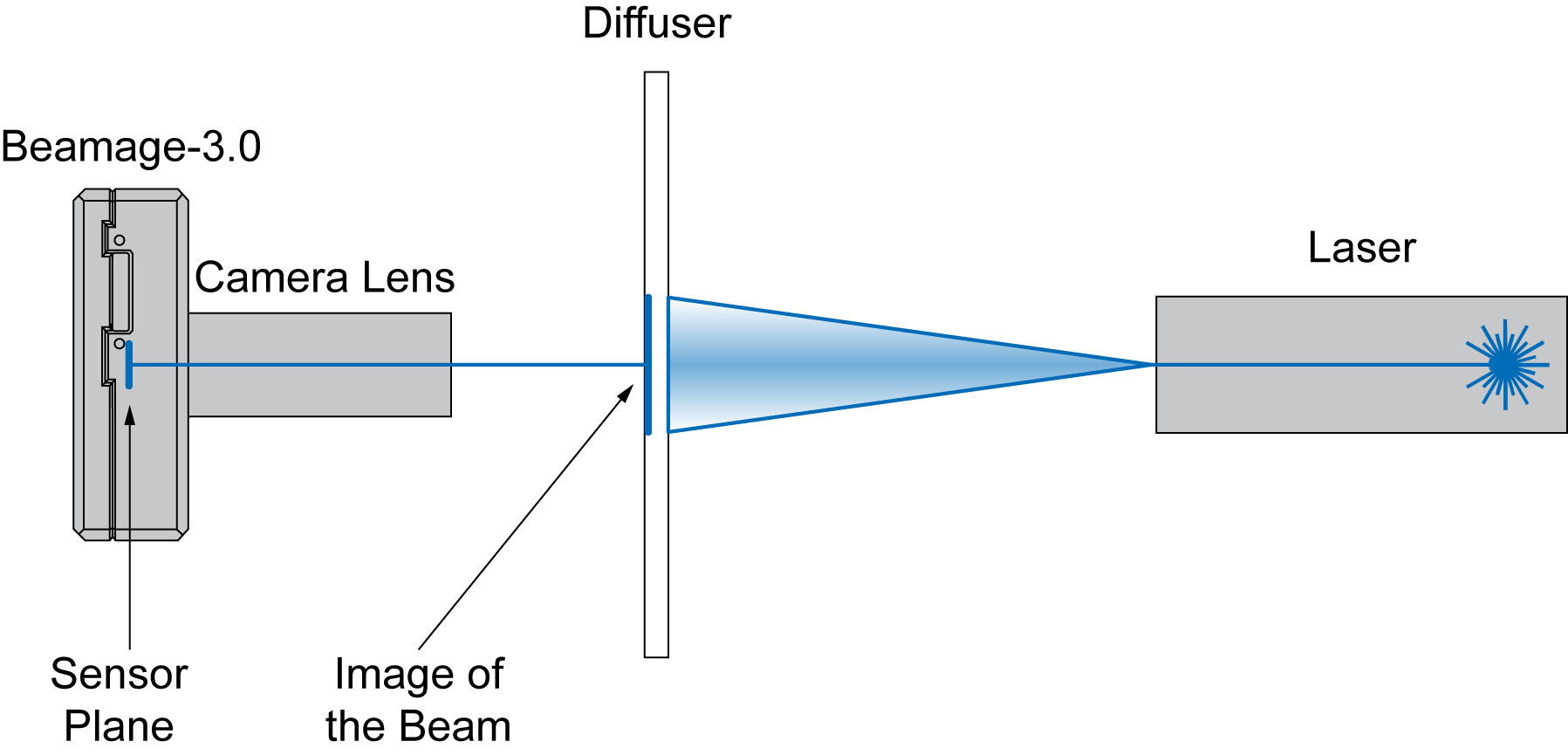 The camera lenses in the CL series work by indirectly imaging the reflection or transmission of the beam after it has hit a diffusing element. For larger beams, simply increase the distance between the diffuser and the BEAMAGE.