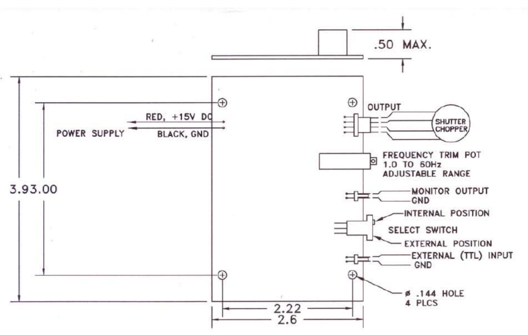 In internal mode, the shutter acts as an adjustable low-frequency (0.5 to 50 Hz) optical chopper. An internal oscillator and multiturn potentiometer control the laser shutter blade position. The internal oscillator has a minimum frequency stability of 0.1%.