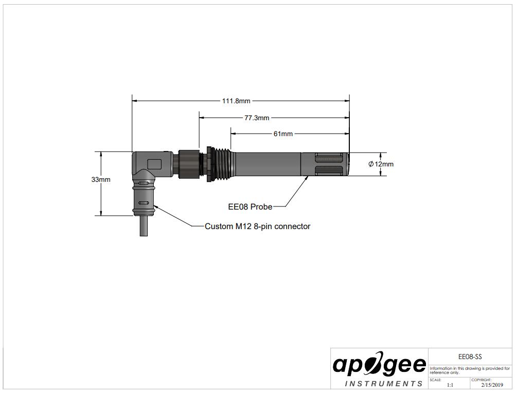 The Apogee EE08 is a customized version of the EE08 probe made by Austrian manufacturer E + E Elektronik. After years of evaluation, the EE08-SS has emerged as our sensor of choice over more expensive probes for accuracy, stability, and durability. The Apogee EE08-SS features an improved right-angle, IP67 rated, stainless-steel M12 connector; heat-reflective white cabling; and a more durable, metal-grid dust filter. These features added by Apogee only slightly increase the price over the base model from E + E, but greatly improve the performance and reduce the maintenance of the probe, especially when used with a fan-aspirated radiation shield like the Apogee TS-100.