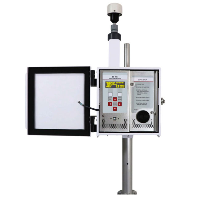 The ES-405 is a near reference air quality sensor designed to provide accurate real-time measurements of PM10, PM4, PM2.5, and PM1 particulate concentrations simultaneously. It reports these four key particulate concentrations in both indoor and outdoor environments. The rugged weatherproof enclosure allows use in the harshest environments for reliable continuous outdoor operation, and the inlet heater reduces moisture-related measurement error. The sensor incorporates sheath air to prevent particles from contaminating the internal optics of the sensor. The ES-405 can be wall-mounted or installed on a vertical mast.