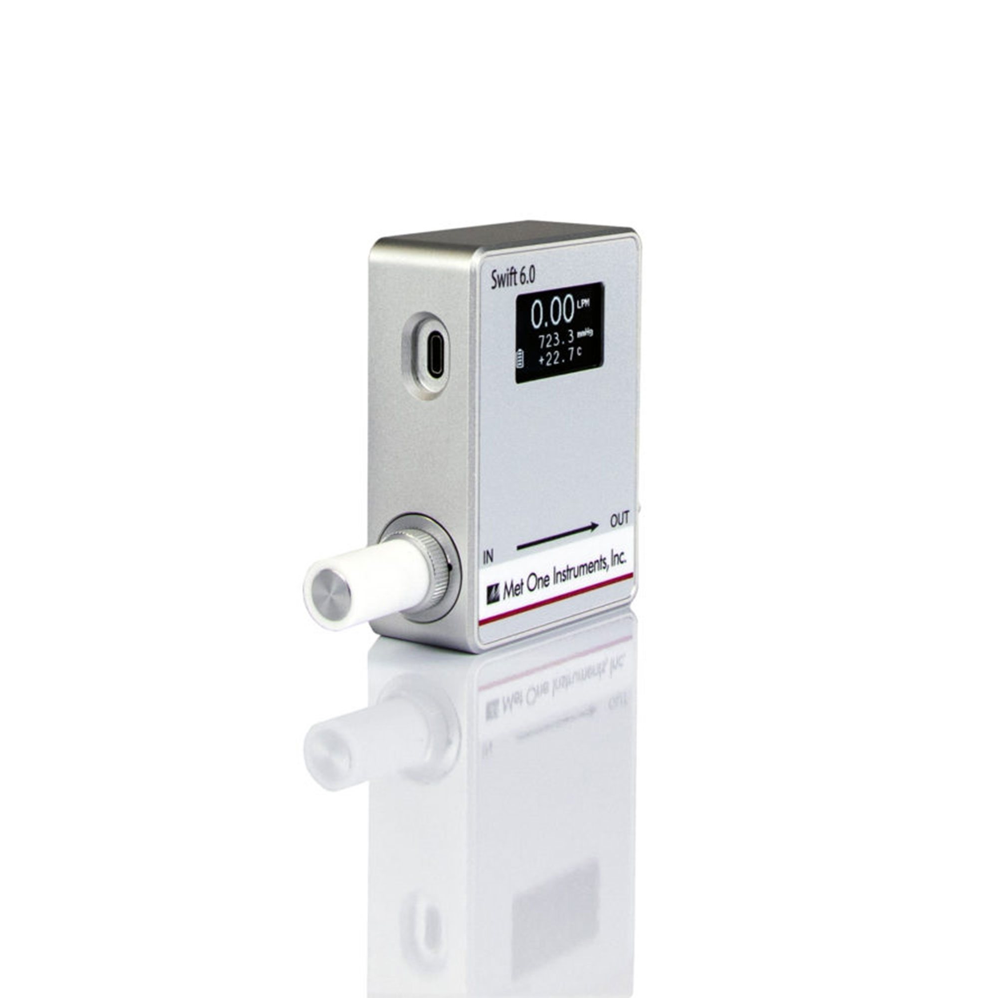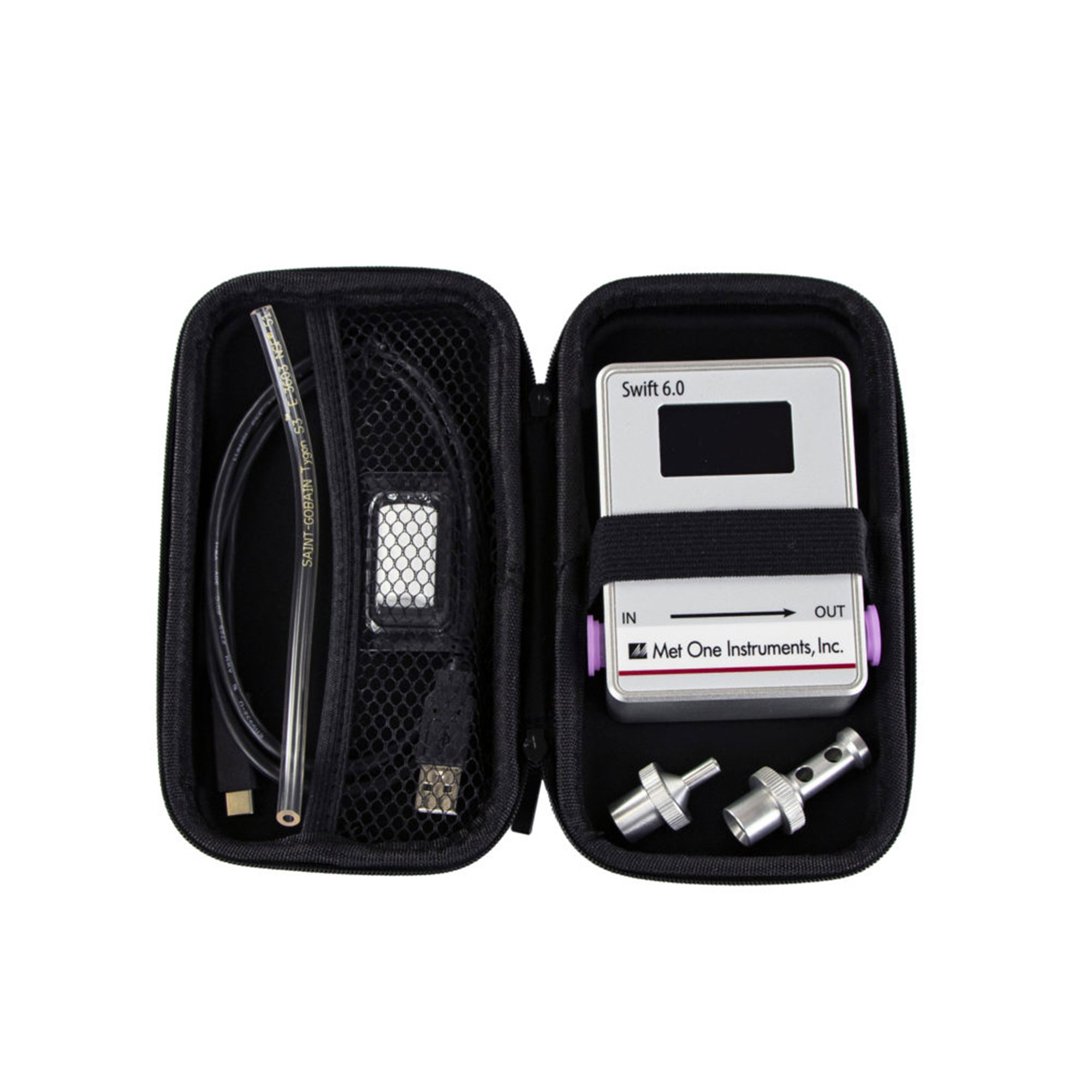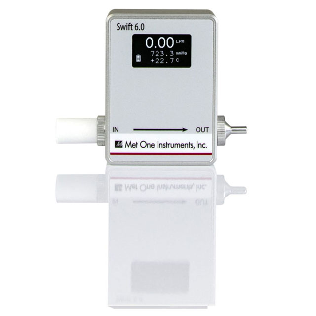 The Swift 6.0 is a multi-function Air Flow Meter specifically designed for accurate low rate measurements. The device’s easy-to-read display shows flow rate, flow temperature, and ambient pressure. Flow measurements are traceable to our NIST standard and certification is provided with each unit. The Swift 6.0 is a truly portable device weighing only 12 oz, with size dimensions of only 2.75 in. x 3.75 in. x 1.25 in.. Met One’s Swift 6.0 comes complete with a portable kit carry case, including flow adapters and a power cable for USB charging.
