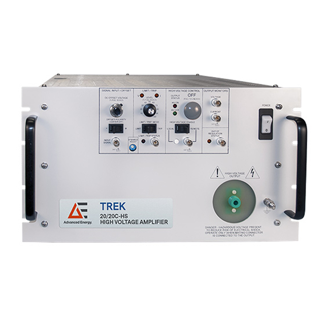 Meet the demands of highly capacitive or reactive loads. The DC-stable Trek 20/20C high-voltage power amplifier has a four-quadrant, active output stage that is essential to achieve accurate output responses and high slew rates. It sinks or sources the current into reactive or resistive loads throughout the output voltage range. The Trek 20/20C is used in numerous industrial and research applications such as material characterization, ferroelectrics, and atmospheric plasma. Advanced Energy’s Trek 20/20C-HS high voltage amplifier offers three times more peak current, a higher slew rate, and even more bandwidth.